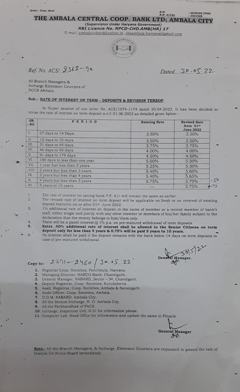 The Cooperative Societies Act of 1912 was endorsed in the Punjab in the year 1912 and Shri. Sanglly was appointed as the Registrar, Cooperative Socities Punjab.A meeting of the Landlords and other respectable persons of the Ambala District was called on 14th Nov, 1912 which was presided by Sh. R.T.Clerk, the then Deputy Commissioner of Ambala City. The following office bearers were elected for taking further steps in this respect. President * Sh. R.T. Clerk.Deputy Commissioner, Ambala Vice President *Khan Sahib Nazar Mohamad Ambala City.* R.B.L Banarsi Dass.Mill Owner, Ambala Cantt. Honorary Secretary. R.B.L. Ganga Ram, Honorary magistrate, Ambala City. It was decided that the working capital of the bank should be Rs. 2 Lacs, consisting of 2000 shares of Rs. 100/- each 767 Shares of the value of Rs. 76700/- were sold at the spot and upto the end of December 1912, 1660 shares were sold to the individuals . And Bank was registered on 15the March, 1913 and it started its working on 31st August, 1913. Thus The Ambala Central Cooperative Bank Ltd; Ambala came into inception on 15th March.,1913 in the wake of the enforcement of Cooperative Societies Act,1912 in the state of Punjab. Its area of operation was extended to District Ambala, District Karnal, District Jalandhar, District Ludhiana, and District Simla at that time. As a result of re-origination of states and by the passage of time its area of operation was delimited and it now confines to AMBALA DISTRICT only, consisting of 3 Tehsils, and 3 Blocks which are as under :- TEHSILS. AMBALA,BARARA,NARAINGARH. The Membership of the Bank is restricted to Co-operative societies alone. Total membership of the Bank at present is 386 Societies and 1148 Associate Members ( though associate members are also members of the bank, yet they has no right to vote in the Election of Directors of the Bank ) which comprises of Mini banks, Industrial Societies, Milk Supply societies, Labor and Construction Societies, and other types of societies. The Haryana State Government is also a member of this Bank......